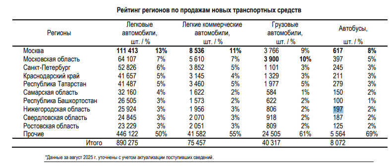 В целом по стране в январе-сентябре 2025 года, по данным АО «ППК», продано 890 275 легковых автомобилей (-22% к аналогичному периоду 2024 года), 75 457 лёгких коммерческих автомобилей (-21%), 40 317 грузовиков (-56%), 8 072 автобусов (-45%).