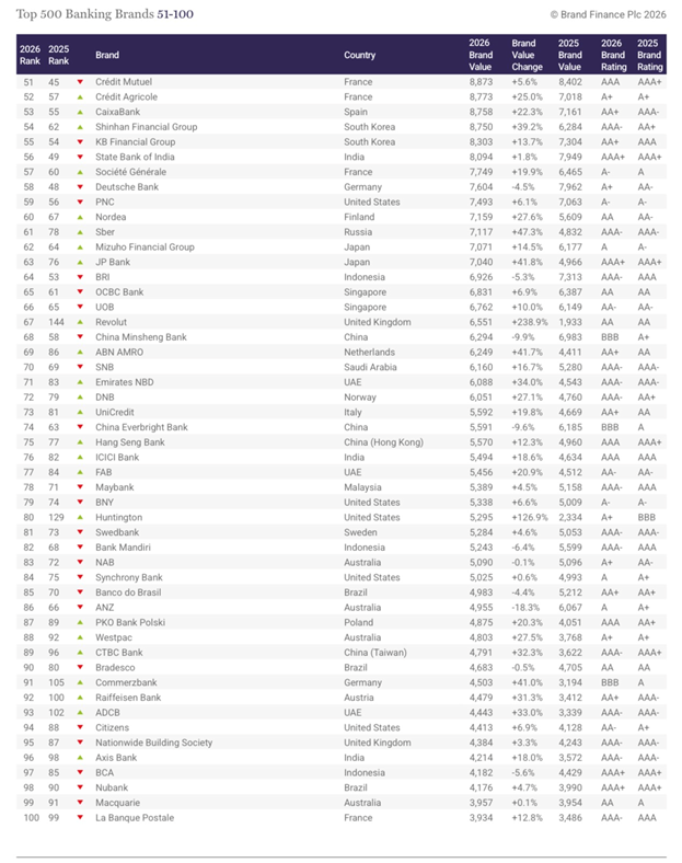 К слову, в первую «сотню» рейтинга вошли банки стран-участниц БРИКС: индийские HDFC Bank (41-е место), Axis Bank (96-е), а также Emirates NBD (71-й), FAB (77-й) и ADCB (93-й) из ОАЭ и барзильские Banco do Brasil (85-й), Bradesco (90-й) и Nubank (98-й).