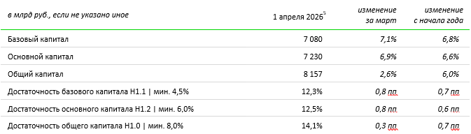 • Расчет нормативов базового и основного капитала не учитывает прибыль за январь-март 2026 г. до проведения аудита. Расчетное влияние проаудированной прибыли за 3 месяца на нормативы составляет порядка 0,9 пп.