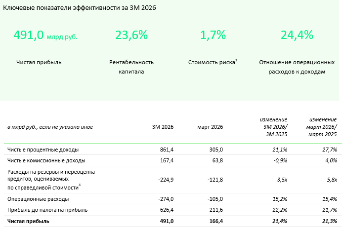 «За первые 3 месяца 2026 года Сбер заработал 491 млрд рублей чистой прибыли, что на 21,4% больше аналогичного периода прошлого года при рентабельности капитала 23,6%. В марте чистая прибыль Банка выросла на 21,3% г/г до 166,4 млрд рублей, рентабельность капитала составила 22,7%.