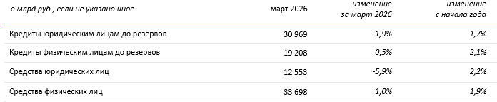 • Стоимость кредитного риска без учета влияния изменения валютных курсов составила 1,7% за 3 месяца 2026 г. против 0,7% за аналогичный период прошлого года. В марте этот показатель составил 2,4% (1,2% годом ранее).